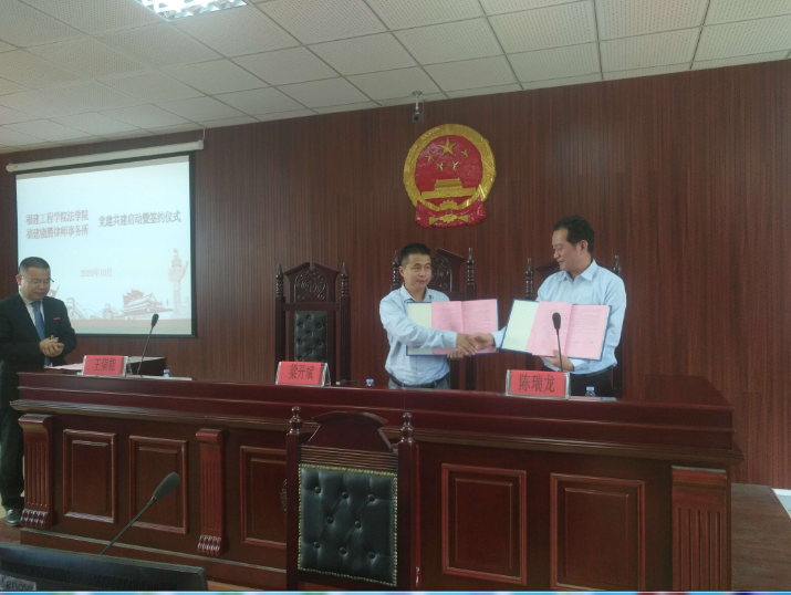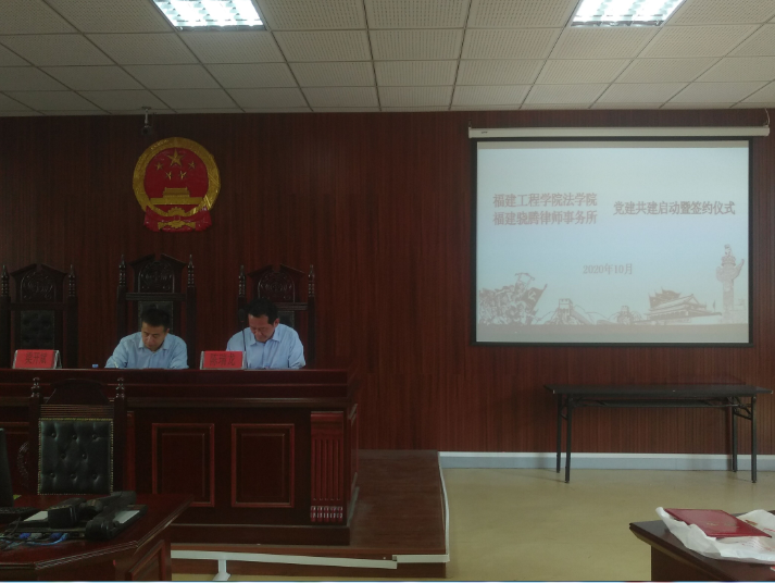 2020年10月28日下午,我院党委与福建骁腾律师事务所党支部党建共建签约仪式在大教西二模拟法庭进行,会议由学院王崇能副教授主持。学院党委临时负责人、副院长(主持)梁开斌出席会议,并与福建骁腾律师事务所党支部书记、律所主任陈瑞龙签订党建共建协议书。