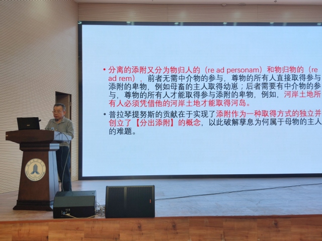 本次学术讲座从“第322条文本与其分析”开始,徐国栋教授以我国《民法典》第322条规定为切入点,引出了对于“添附”概念的讨论,并介绍了多位罗马法法学家关于添附的论述。通过列举一系列贴近生活的例子,徐国栋教授讲述了查士丁尼《法学阶梯》关于添附的无定义规定和法国佚名作者把添附与加工分家等内容,并通过将日本、德国等国关于添附的相关规定与我国现行规定相比较,指出我国民法典322条关于“添附”存在的问题,从而深刻而又全面地讲解了民法322条的有关知识。并对于《民法典》第322条关于添附的规定进行了进一步的分析,认为其来源于《民通意见》第86条,更多的是一项本土制度,与罗马法传统的添附存在差距,其中以确认可能存在意定添附为甚进行了进一步的说明。使在座的师生受益匪浅。