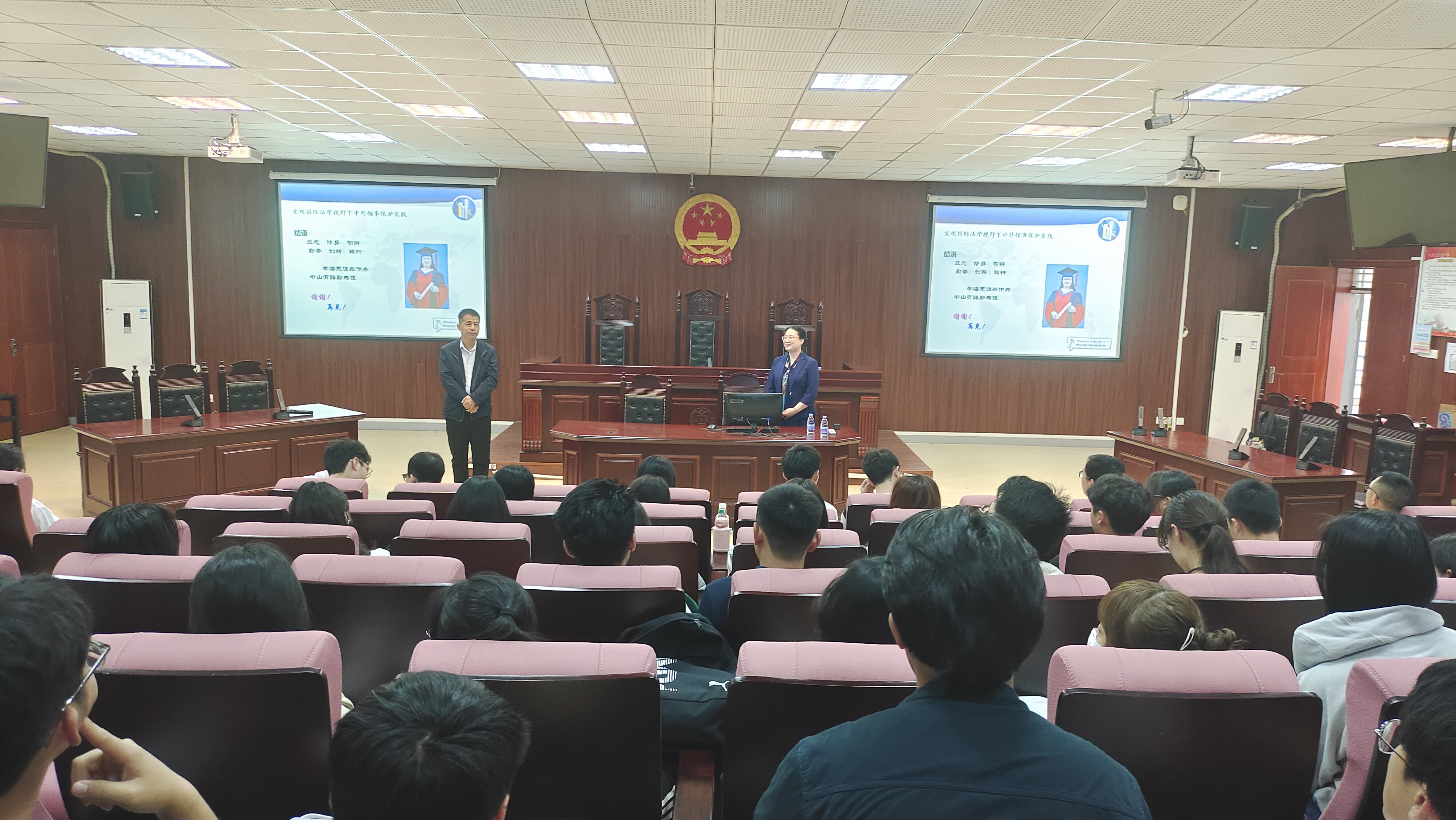 许育红博士结合自身近40年的领事工作经验,以幽默诙谐的语言引入“外交”的内涵,通过搭建“一个视角,两组关系,三层法律,四样阶段”的框架,对“国际法视野下中外领事保护实践”进行系统梳理;并结合一个个相关案例,生动地阐明了中国公民海外合法权益受到侵害时应当如何寻求救济的问题。讲座尾声,许育红博士以“立志、修身、明辨、勤奋、创新、笃行”十二字箴言作结,激励在场师生以更加开拓的视野关注外交和领事实践,点明学习国际法的重要意义。